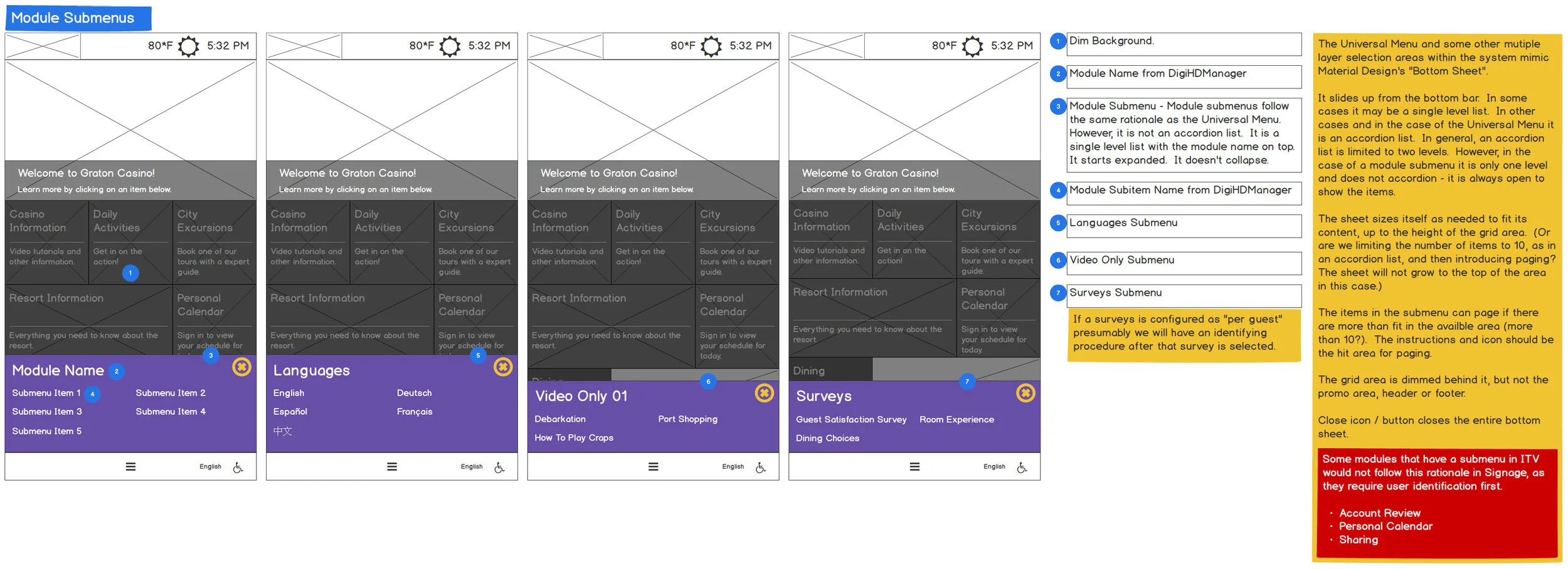 Interaction.A small footer bar that would display throughout, offering a “back” button, a “universal menu” button that resulted in a bottom sheet of modules, a change languages button and an ADA button that shifted the screen lower.