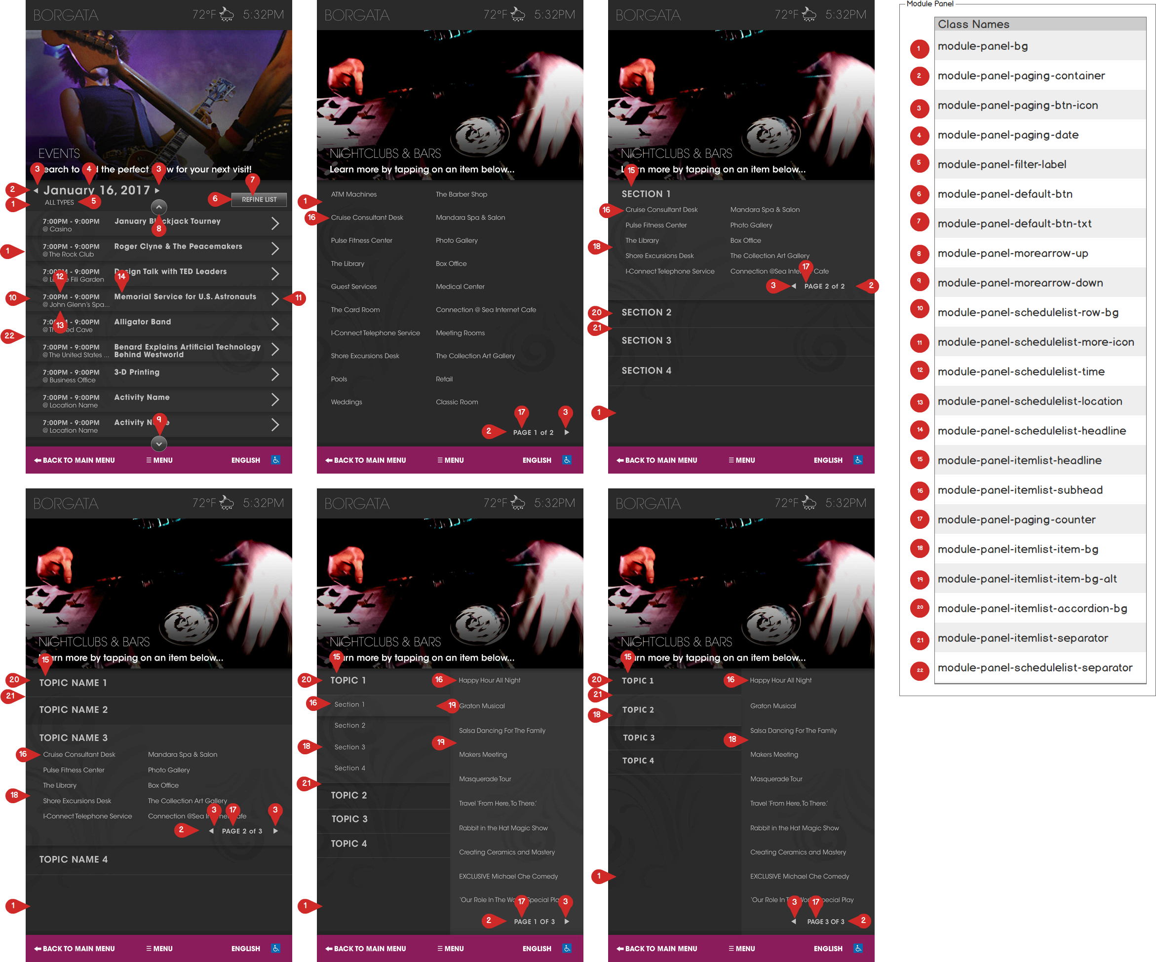 For developer hand-off the designs were annotated with CSS class names to indicate that a type of element was the same thing on different pages.